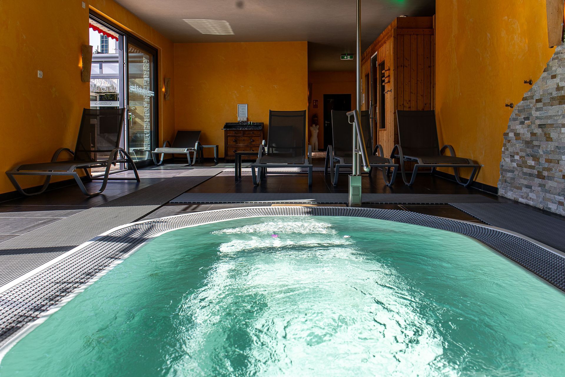 In the sauna area, we offer a whirlpool and loungers for relaxation and rejuvenation. Our sauna area is complemented by a dry sauna with high temperatures. There is also a beautiful outdoor area with a spacious swimming pool.